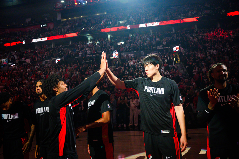 北京时间2025年10月23日,开拓者队球员杨瀚森(前右)与队友夏普(前左)在赛前击掌。当日,在2025-2026赛季NBA常规赛中,波特兰开拓者队主场114比118不敌明尼苏达森林狼队。开拓者队中国球员杨瀚森替补出战,迎来自己的NBA常规赛首秀。\n 新华社/美联