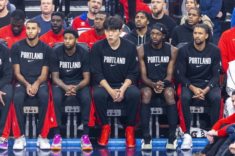 新华社照片,开拓者队球员杨瀚森(中)与队友在替补席观战。\n