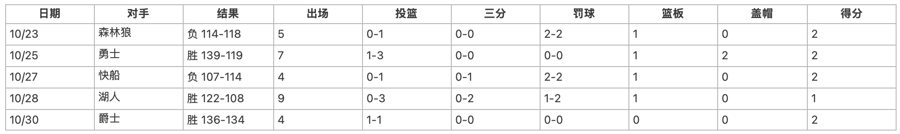 无论如何,现在下定论为时尚早。首先样本太少:总计29分钟、9次出手很难代表真实水平。开赛的这5战全部是强度不低的西部对手(森林狼、勇士、快船、湖人、爵士),且他更多在替补与比赛碎片时间登场,容错率与参与度都有限。此外,教练组在季前赛反复强调他“正在变得更好”,相信球队内部对他的培养方向是比较清晰的。