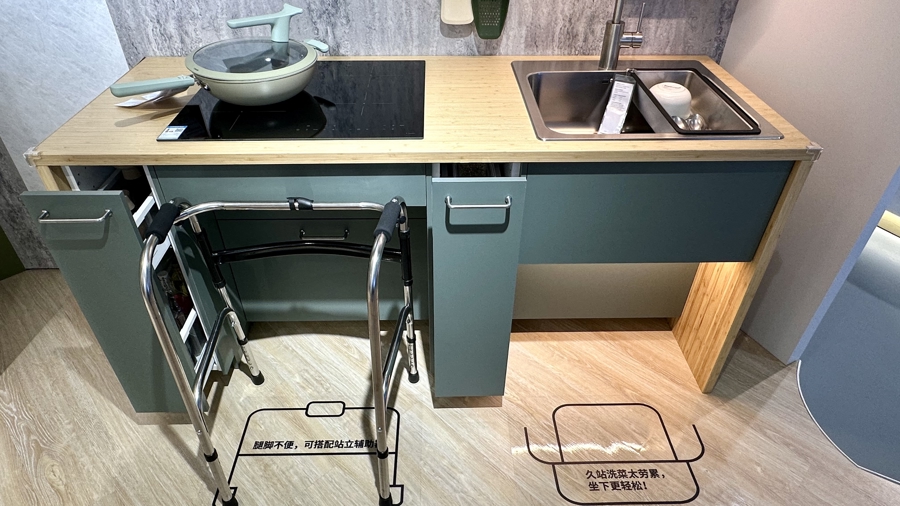 在适老化厨房,水槽和灶台下方都向内收缩了20-30厘米。“老人长时间站立着洗菜切菜会感觉劳累,向内缩进的灶台前方便放置站立辅助器。水槽前则可以放一把椅子坐着洗菜、择菜,预留出下方位置是为了给双腿腾出空间。高低台面的设计符合老两口的不同身高,全玻璃面板的橱柜一目了然,方便老人拿取。”展台工作人员介绍。