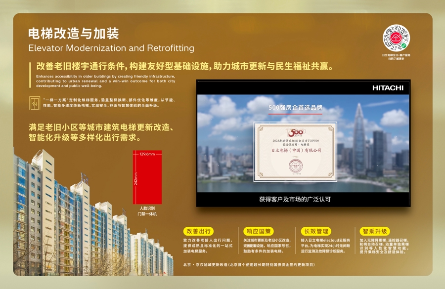 除了松下,其他日本企业也瞄准了中国“银发经济”的商机。在4.1H馆,日立电梯根据日本比中国早三十年进入老龄化社会的应对经验,展示了在“电梯加装”和“电梯改造”方面的解决方案,推动城市更新及老旧小区改造。“一梯一策”的定制方案响应了节能、性能、智能、美观等需求,轮椅自动召梯、无障碍乘梯等人性化智慧功能,也提升了老年人的乘梯安全性及舒适度。