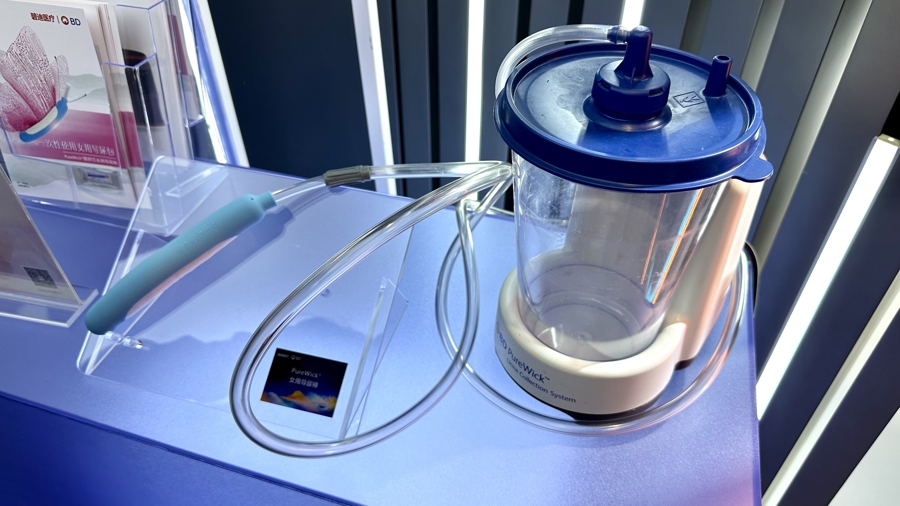 其中,为居家卧床老年女性设计的PureWick女用导尿棒吸引了很多观展者驻足。“以往手术后的导尿管是有创的,对于老年女性非常痛苦,而且护工或家人半夜需要起床为老人导尿,非常辛苦。而这款产品是无创的,置于老人体外进行导尿,尿液吸出后收集在容器中,老人和照护者整晚都能安心睡觉。”碧迪医疗大中华区企业品牌公关及数智传播总监李莎介绍。