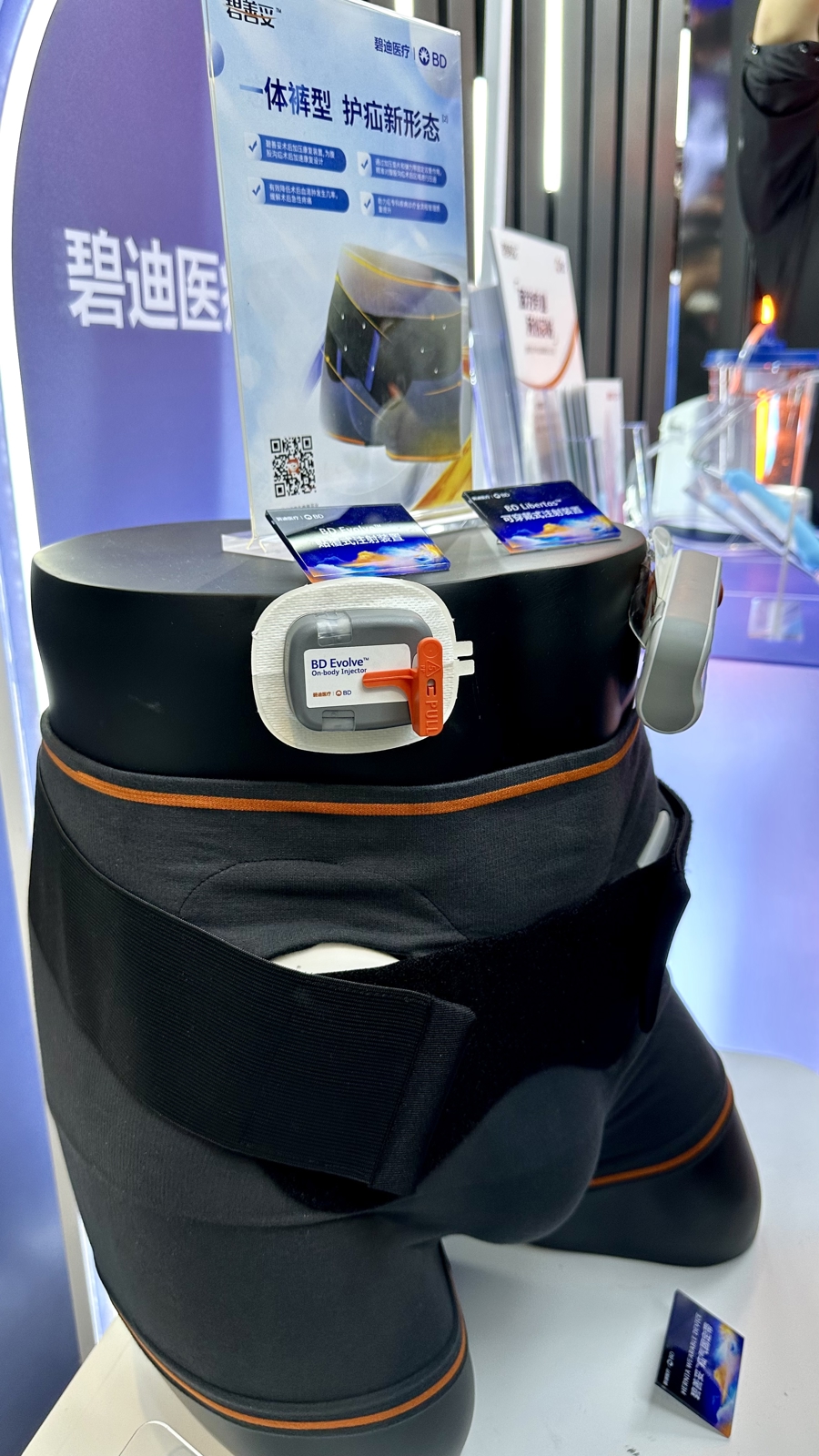如同一条普通内裤的“疝气裤”,非侵入式无创女用导尿管,笔式注射器和可穿戴式注射装置……在1.1H馆,碧迪医疗展台的“悦享银发健康生活馆”展示了多条产品线的适老产品。