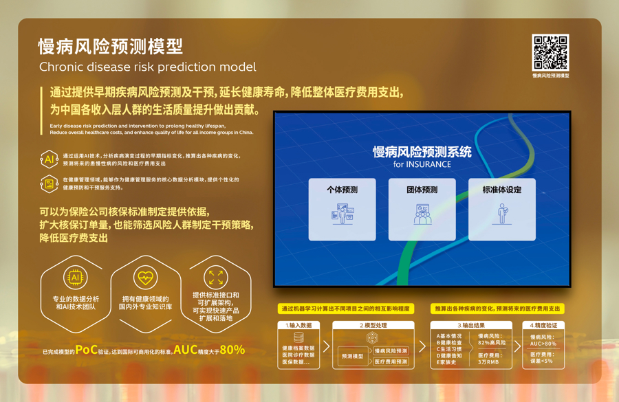 日立展台的养老医疗健康板块,多款瞄准“银发经济”的先进产品、理念和方案也惊艳亮相。“慢病风险预测模型”就很神奇,只要输入一些健康数据,就能通过AI技术分析疾病演变过程的早期指标变化,从而推算出将来患慢性病的风险和医疗费用支出。“这个模型适用于两大场景,一个是保险行业的风控理赔核保,另一个是健康管理行业。”日立(中国)有限公司中国区市场营销统括室副总经理王桢说。