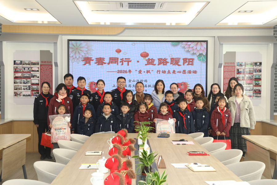在第六个中国人民警察节来临之际,1月7日上午,上海边检总站金山边检站组织青年民警志愿者走进上海中医药大学附属枫泾小学,开展“青春同行·益路暖阳”2026年“爱枫”行动点亮心愿活动,为18名学生送上精心准备的新年礼物。