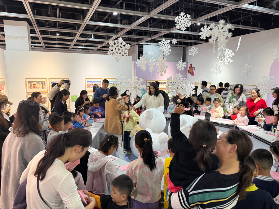 为让亲子家庭深度参与,展览突破传统模式,打造“可看、可玩、可创”的沉浸体验:绘本形象气模可供合影留念,阅读区陈列优秀图画书供随手取阅,互动墙“陪马儿奔跑”“修月亮”等玩法让孩子动手动脑,专属创作环节更能让孩子带走自己的“画作”,充分激发艺术热情。