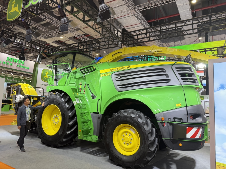 走进技术装备展区,美国农业机械设备龙头企业约翰迪尔的展台“压迫感”十足,展品8600型号青贮机超3米的高度加上6米多的车身长度,几乎占满整个展台。